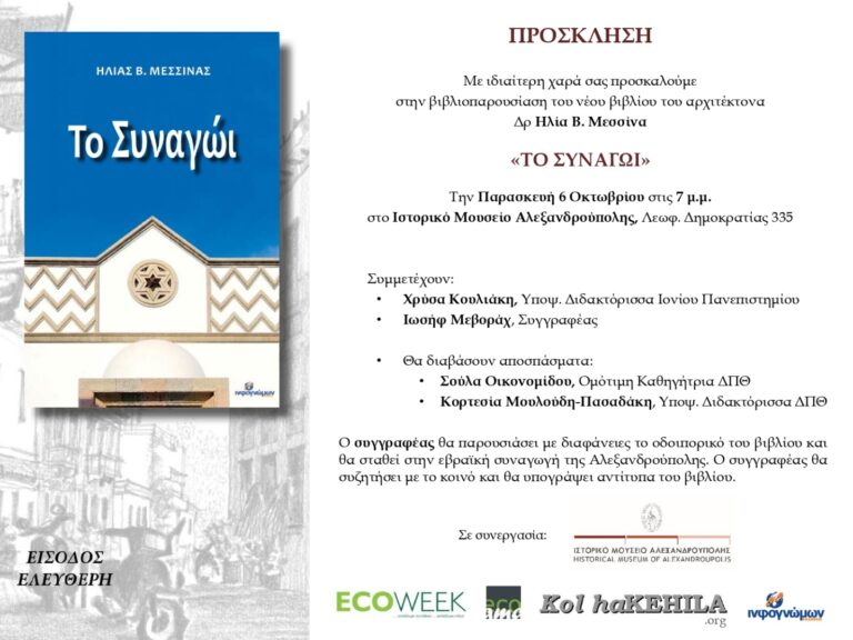 Με ιδιαίτερη χαρά σας προσκαλούμε στην βιβλιοπαρουσίαση του νέου βιβλίου του αρχιτέκτονα Δρ Ηλία Μεσσίνα «ΤΟ ΣΥΝΑΓΩΙ» Την Παρασκευή 6 Οκτωβρίου στις 7μ.μ. στο Ιστορικό Μουσείο Αλεξανδρούπολης, Λεωφ. Δημοκρατίας 335. Συμμετέχουν: Χρύσα Κουλιάκη, Υποψ. Διδακτόρισσα Ιονίου Πανεπιστημίου Ιωσήφ Μεβοράχ, Συγγραφέας Θα διαβάσουν αποσπάσματα Σούλα Οικονομίδου, Ομότιμη Καθηγήτρια ΔΠΘ Κορτεσσία Μουλούδη – Πασαδάκη, […]